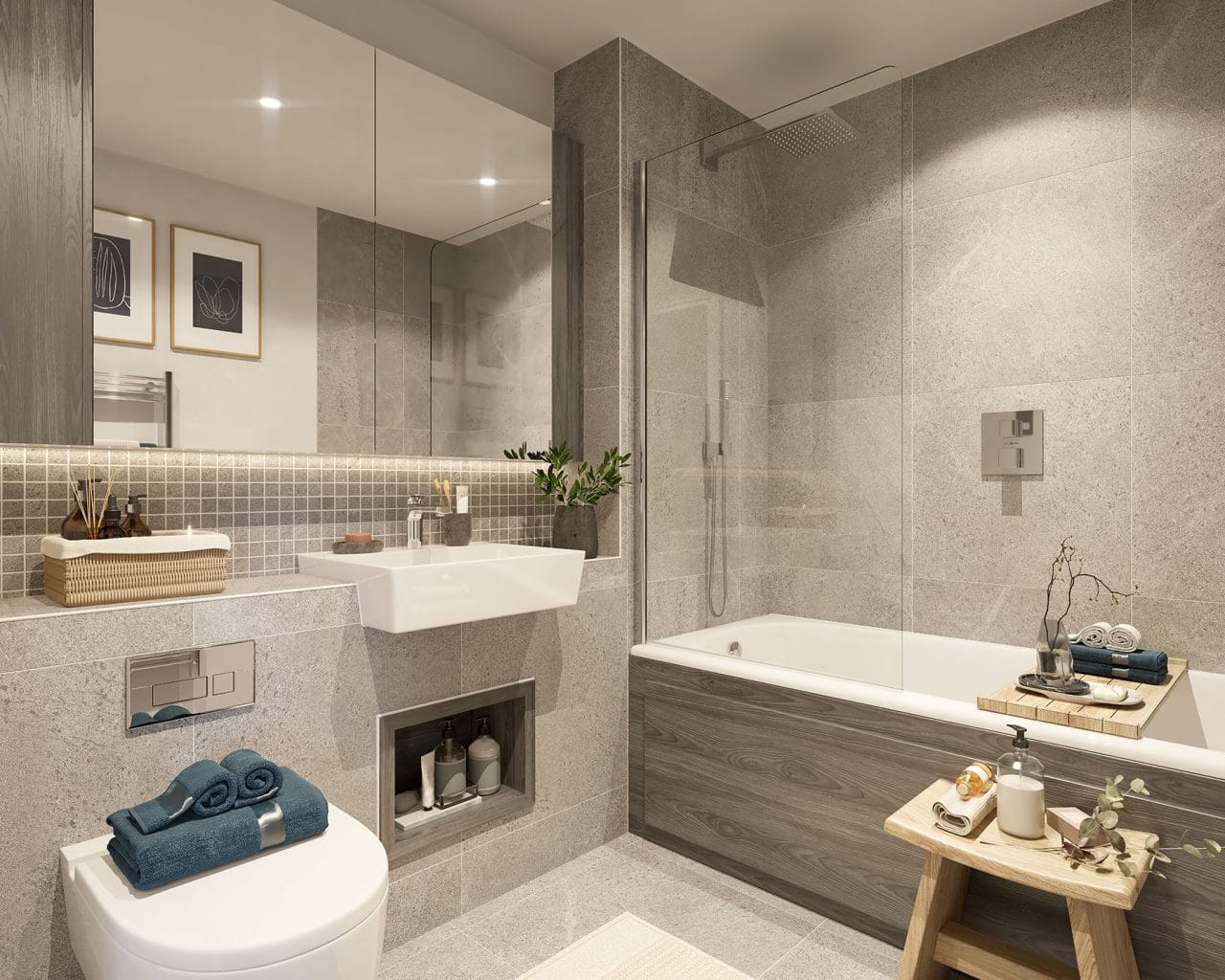 - • Low-profile shower trays with glazed screens and full-height tiling in wet areas