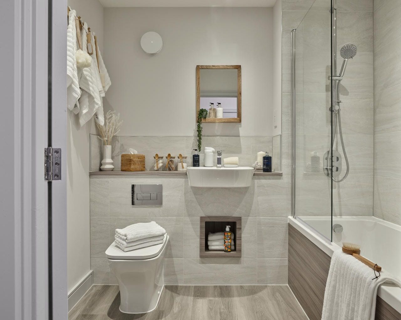 Sleek white fixtures and sparkling chrome fittings give your bathroom a fresh, contemporary feel, making it the perfect place to unwind at the end of a busy day. Practical details, including recessed storage and heated towel rails, show we have thought of everything.